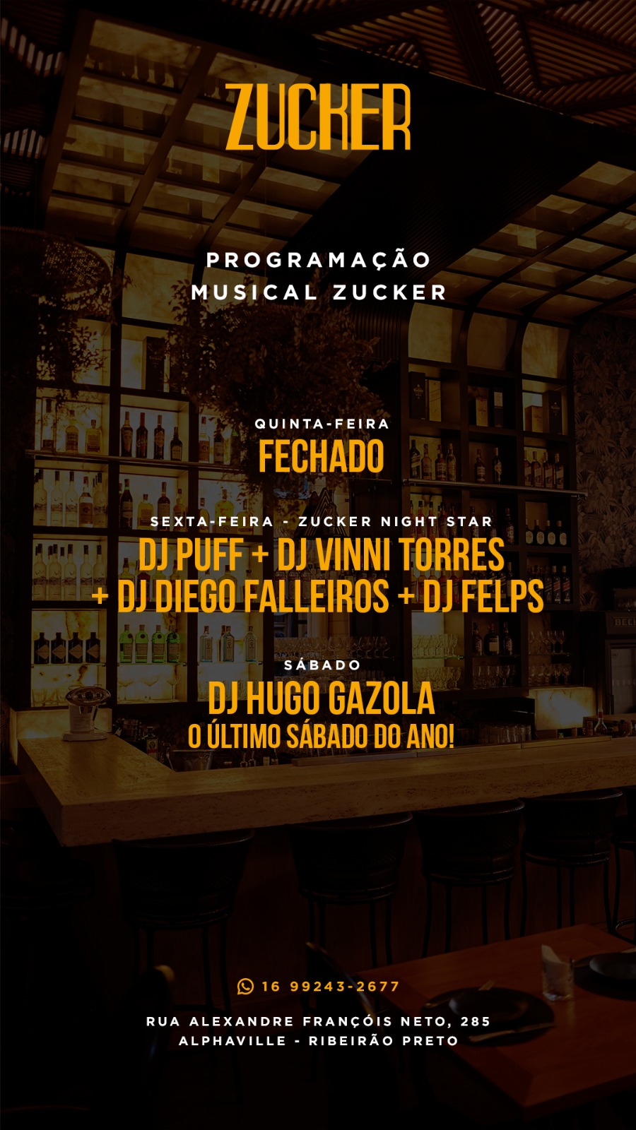 Nesta semana, começando em 23 de dezembro, o Restaurante Zucker faz a última edição do ano do Zucker Night Star, que acontecerá na sexta-feira, 26. A noite contará com o comeback do DJ Puff, que com seus sets intensos e uma mistura de Hip House, Hip Hits e Pop cativou os mais de 20 mil ouvintes mensais no Spotify.