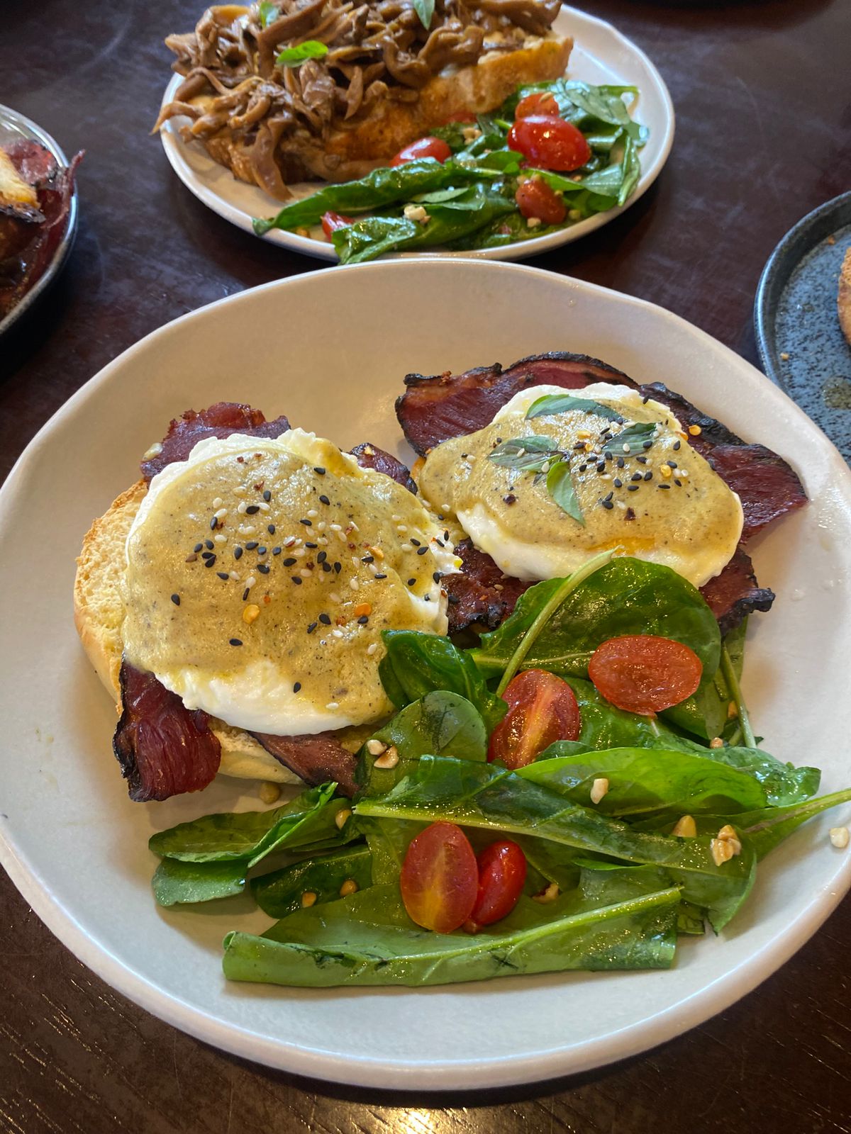 Brunch Mais Um Copo (pão de fermentação, figo grelhado, cogumelos grelhados, coalhada seca, rúcula, tomate cereja, ovos mexidos e Parma).