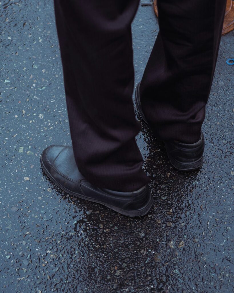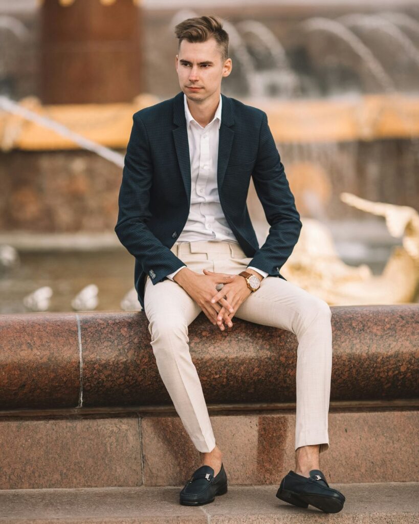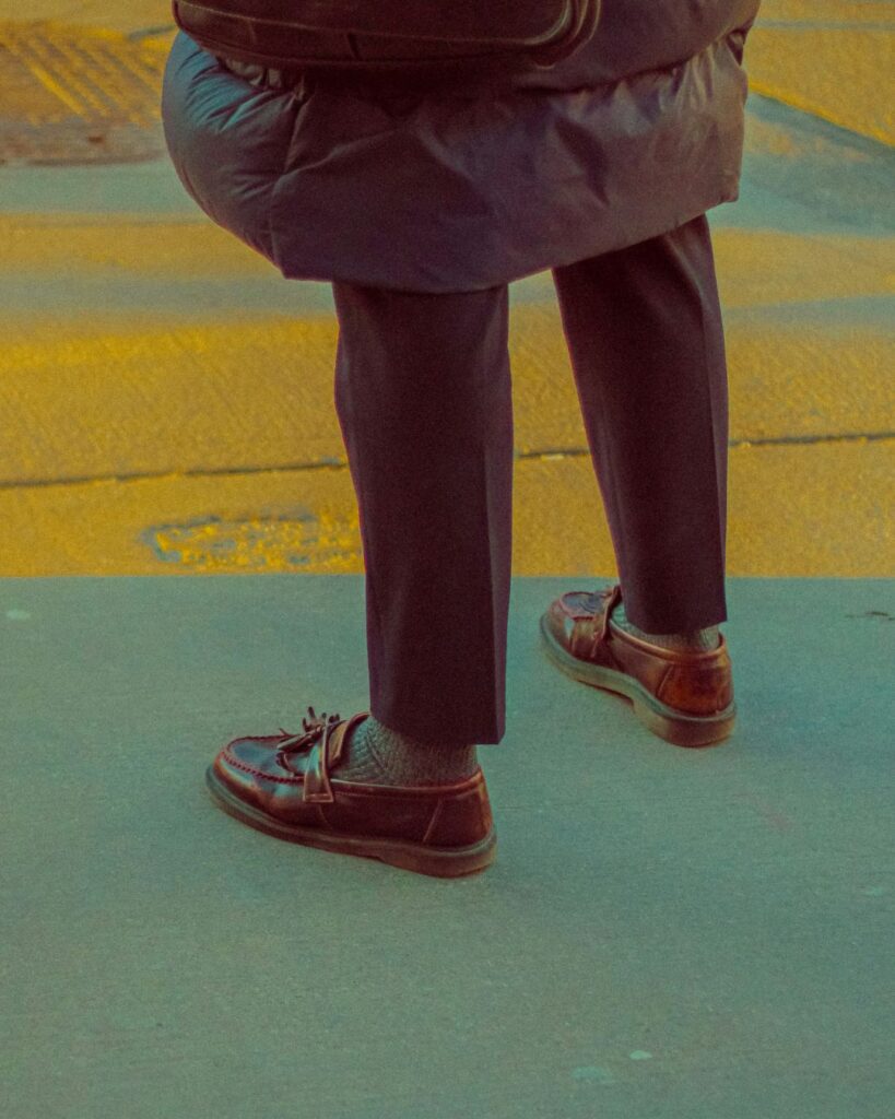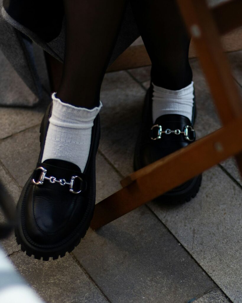 Usar mocassim com meia visível se tornou um recurso de estilo nas últimas temporadas. A proposta, antes considerada informal, foi incorporada de forma intencional a looks urbanos. Meias em cores sólidas, estampas discretas ou até em tons contrastantes criam um ponto de atenção no visual e ajudam a estruturar a composição. O truque funciona melhor com calças de barra mais curta ou dobradas, que deixam o detalhe à mostra sem exagero.
