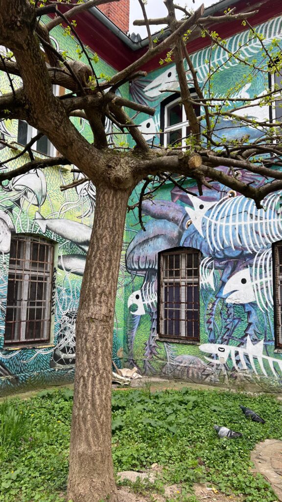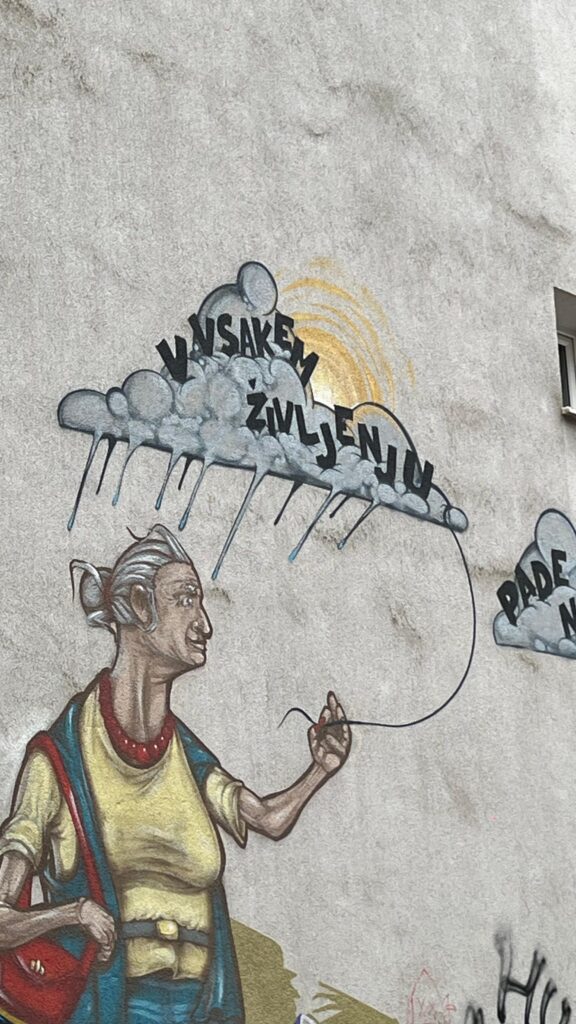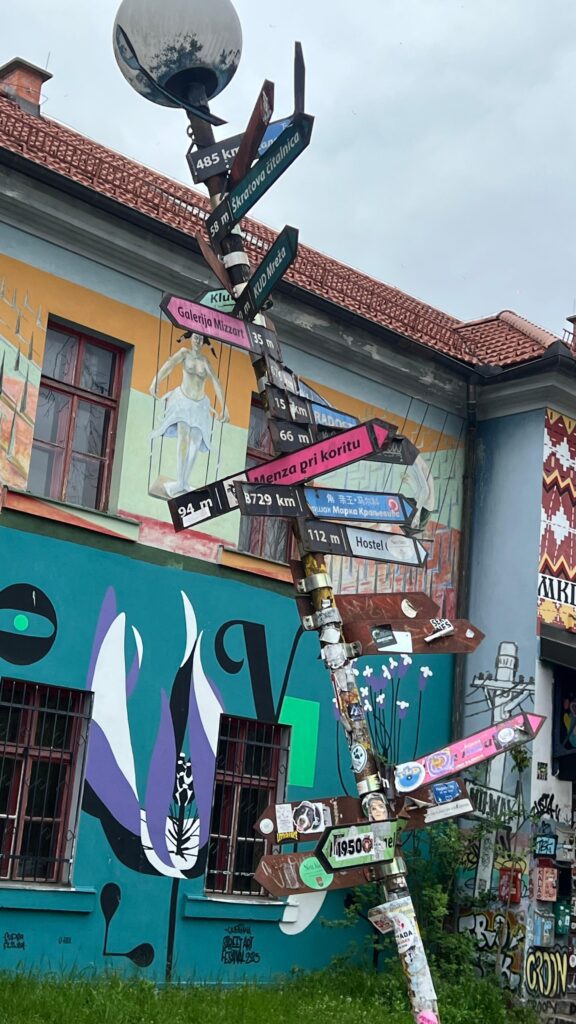 As paredes estão cobertas de murais, esculturas e mosaicos. As janelas se abrem para um mundo livre, plural e criativo. Metelkova pulsa, é resistência e poesia; é o lugar onde a arte se levanta contra o silêncio, onde o passado se dissolve em cor, som e expressão.