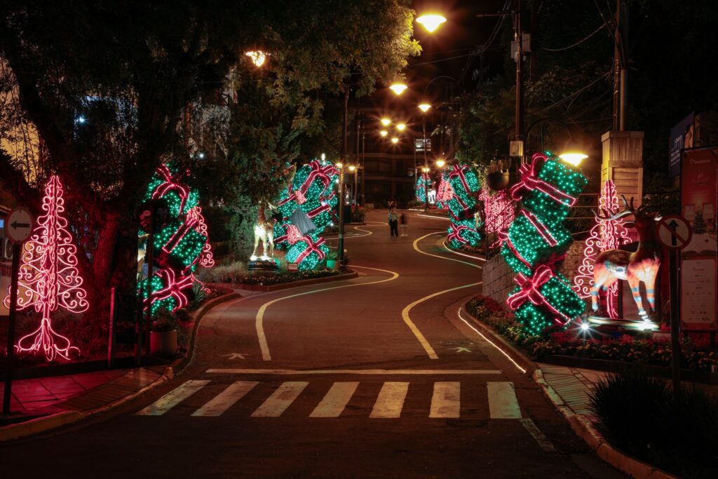 Caminhar pelas ruas de Gramado, nesta época, traz a sensação de estar dentro de um sonho. A iluminação cênica transforma cada esquina em um espetáculo, com luzes brilhantes refletindo na neve (sim, na neve artificial!), enquanto as lojas enfeitadas exibem produtos que parecem ter saído de um conto de Natal: as crianças, com o brilho nos olhos, correm em direção a Papai Noel, enquanto os adultos se encantam com a magia do momento.
