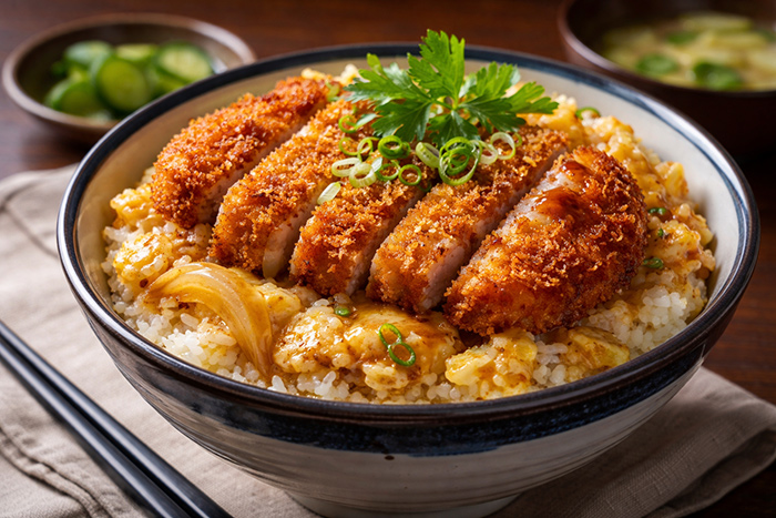 O Donburi (literalmente “tigela”) é um prato japonês que consiste em uma grande tigela de arroz branco coberta com diversos ingredientes, como peixe, carne, vegetais ou ovos, cozidos em um molho saboroso. É uma refeição completa e reconfortante, que varia em sofisticação dependendo do topping (ex: Katsudon com porco empanado, Oyakodon com frango e ovo).