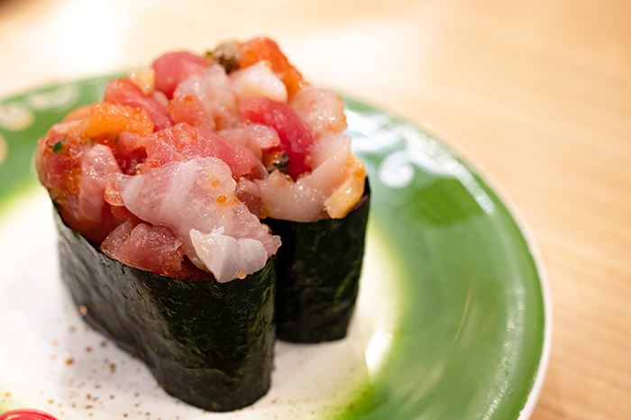 Conhecido como “navio de guerra” (gunkan), é um bolinho de arroz envolto por uma tira alta de nori, criando um “copo” que é preenchido com recheios mais soltos, como ovas (ikura ou massago) ou salmão batido com temperos.