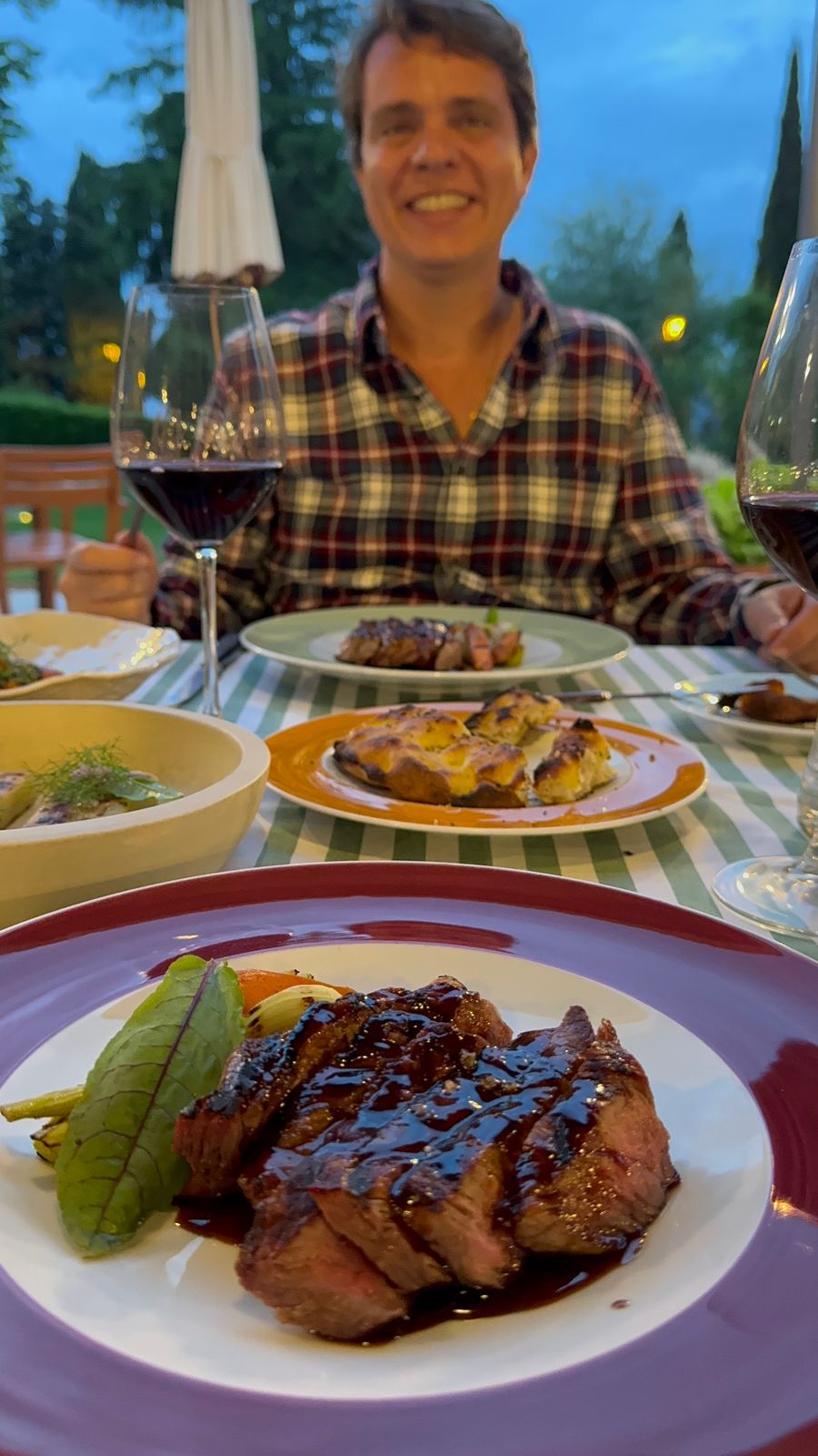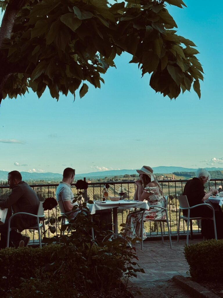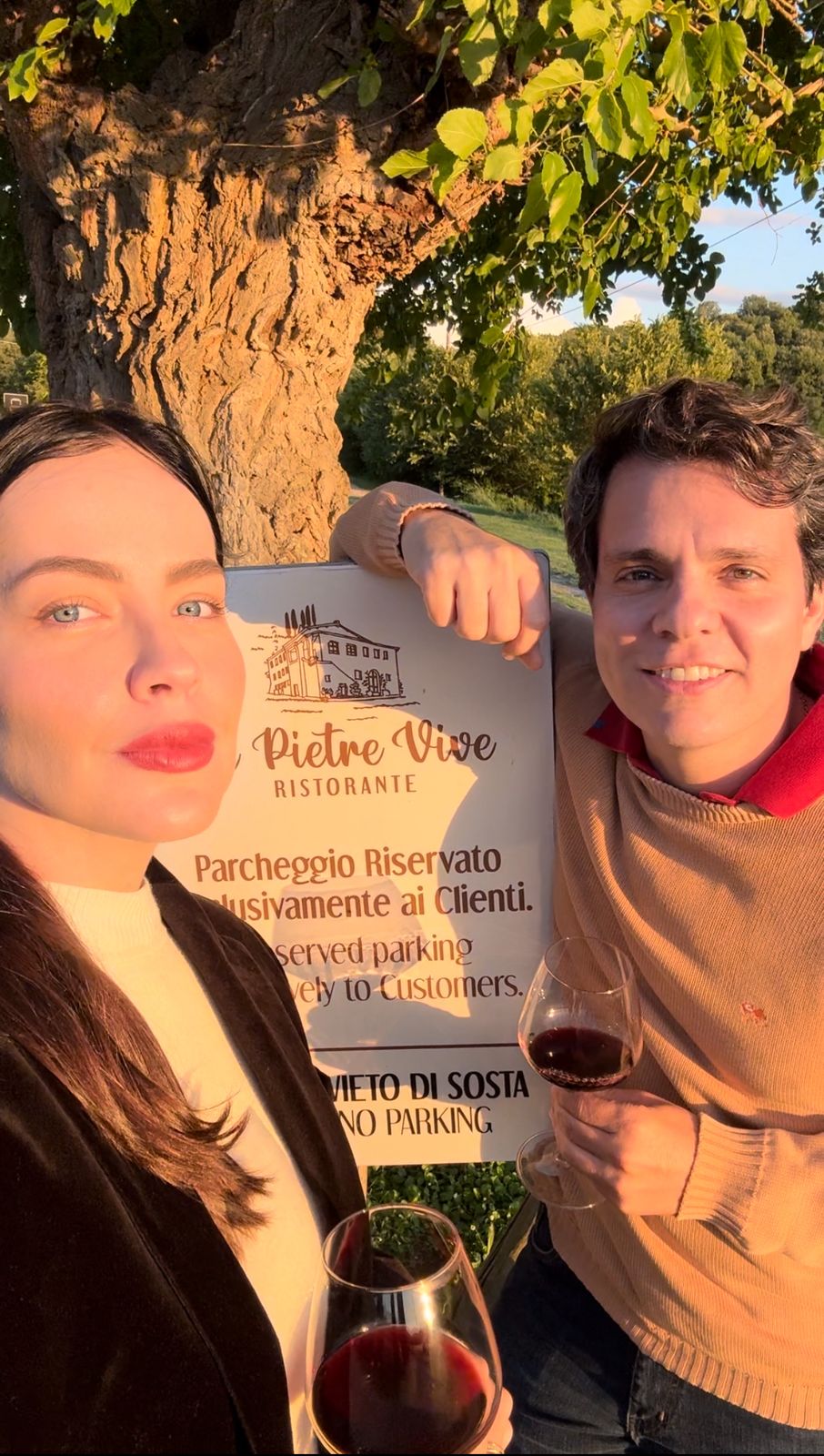 Uma das vantagens de curtir a viagem de carro foi também conhecer um restaurante novo, e agora preferido, na Estrada Chiantigiana, que liga Firenze a Siena. “Descobrimos o Le Pietre Vive quase que sem querer. Lá Nós pegamos um pôr do sol maravilhoso, que desfrutamos com vinho, queijos e pratos impecáveis. Foi um dia assim muito especial”.